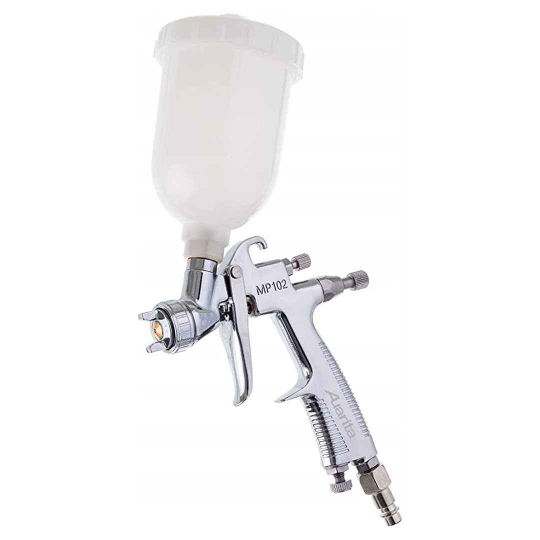 ? Spesifikasi teknis: Model: MP-102. Ukuran nosel: 1,0 mm; teknologi: LVMP MINI; kapasitas tangki: 250 ml; konsumsi udara: 113-170 l/mnt; tekanan operasi: 1,5-2,5 bar.